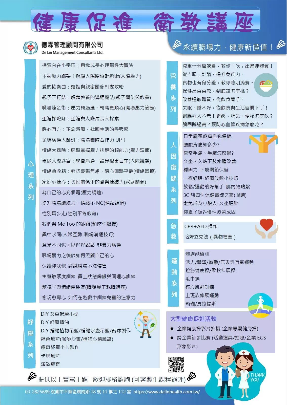 德霖健康衛教講座德霖健康衛教講座(護理師)人因危害預防-彈力帶指導人因危害預防-復健操指導職業病預防-平日保健指導職場不法-宣導講座職場溝通宣導營養師-吃出好健康人因危害預防-物理治療師現場訪視.指導人因危害預防-辦公室保健運動講座人因危害預防-辦公室保健運動講座 分享到